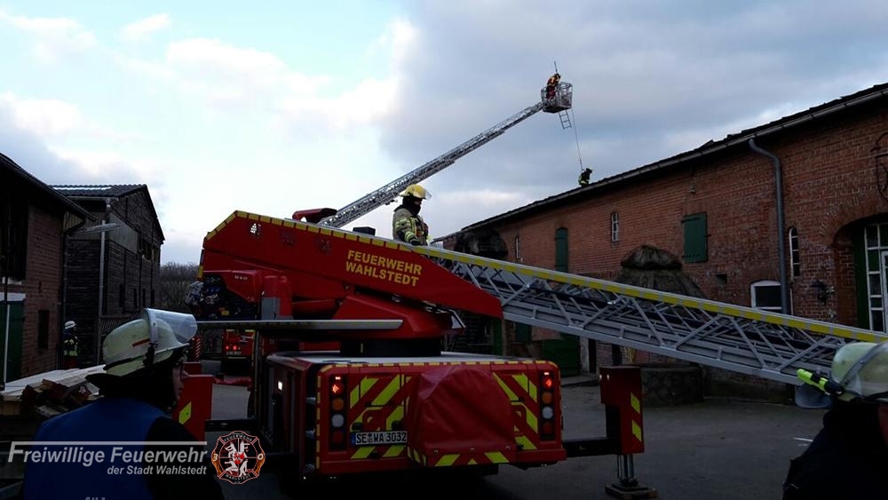 Bei einem ca. 40 meter langem Wohn- und Wirtschaftsgebäude löste sich das Wellblechdach. Zusammen mit dem Drehleiterzug aus Bad Segeberg wurde das Dach gesichert.