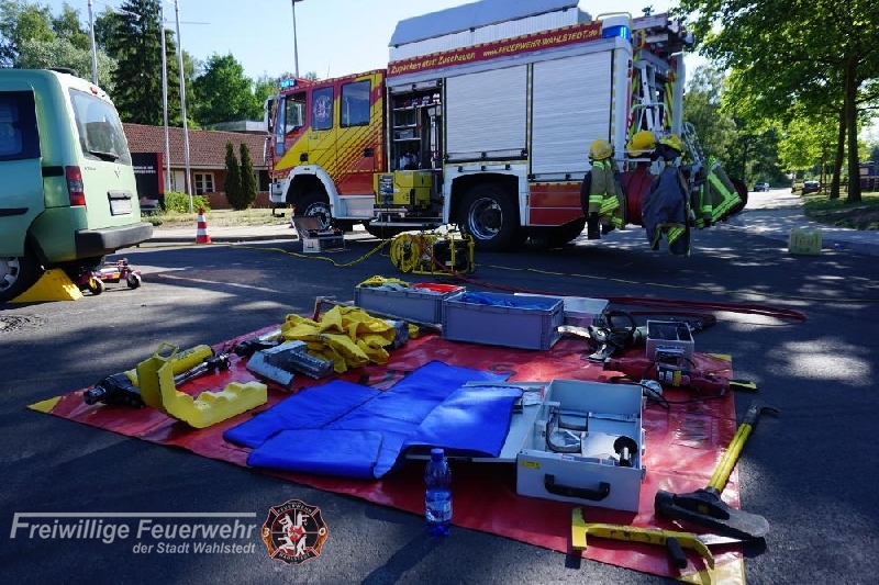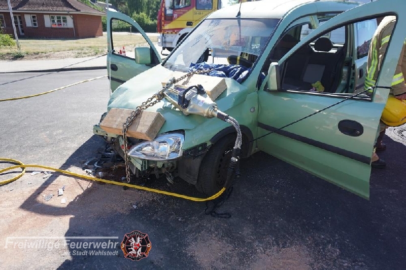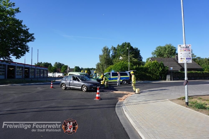 Im Kreuzungsbereich Dr.-Hermann-Lindrath-Straße / Kronsheider Straße kam es am Mittwoch zu einem Verkehrsunfall zweier PKW`s. Um 07:38 Uhr Uhr wurde die Feuerwehr mit dem Stichwort" Auslaufen von Betriebsstoffen nach Verkehrsunfall" alarmiert. Die erste Lageerkundung ergab, dass es zwei Verletzte Personen gab, so das durch die Feuerwehr ein zweiter Rettungswagen angefordert wurde. Ein Patient wurde im Feuerwehrhaus bis zum Eintreffen des Rettungsdienst durch betreut. Die auslaufenden Betriebsstoffe wurden zwischenzeitlich aufgenommen und später der Entsorgung zugeführt. Zwischenzeitlich verschlechterte sich der Zustand des zweiten Patienten, so das durch den Rettungsdienst der Notarzt angefordert wurde. Da sich der zweite Patient noch im Fahrzeug befand und nicht aus dem Fahrzeug geholt werden konnte, musste anschließend umfangreiches technisches und hydraulisches Rettungsgerät eingesetzt werden, um diesen aus dem Fahrzeug zu befreien. Nach ca. 50min konnte der Patient aus dem Fahrzeug befreit und an den Rettungsdienst übergeben werden. Zum Schutz des Patienten wurden u.a. zwei Sichtschutzwände während der Rettungsmaßnahmen aufgebaut.